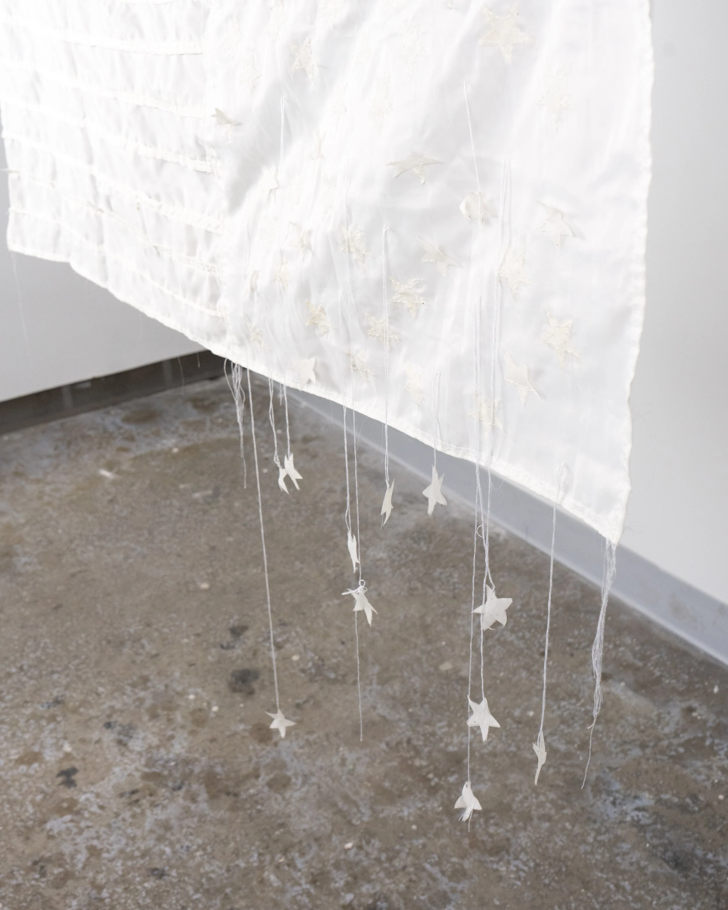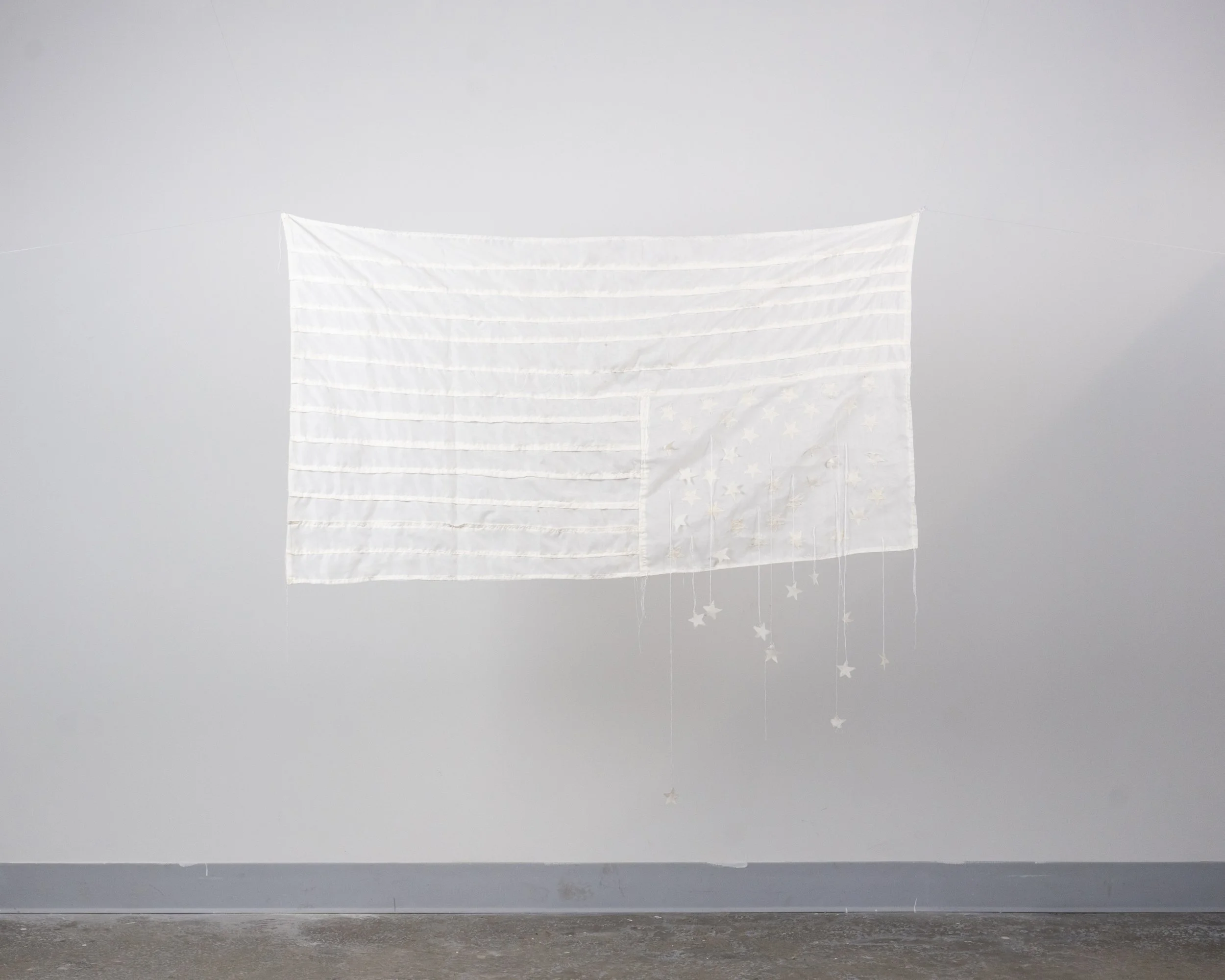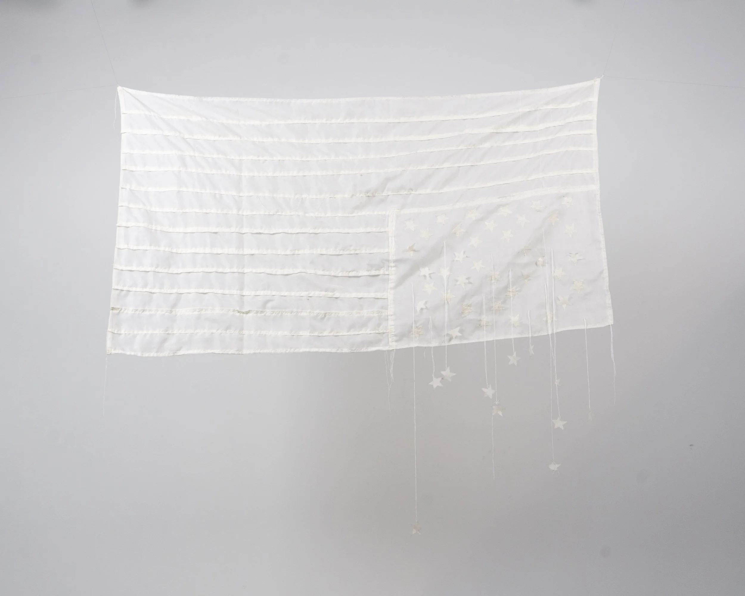 The fabric is white and sheer to reflect the flimsy, colonist ideals the founders based the country on. The flag hangs upside down, a sign of distress meant to be done in times of extreme danger. For immigrants, Black people, and LGBTQIA+, there will always be great danger within our borders. The stars fall off one by one.